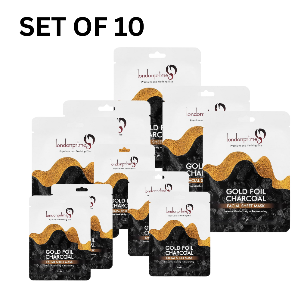 London Prime Gold Foil & Charcoal Facial Sheet Mask Set of 10 – Brightening, Moisturizing & Anti-Wrinkle Glow Boost