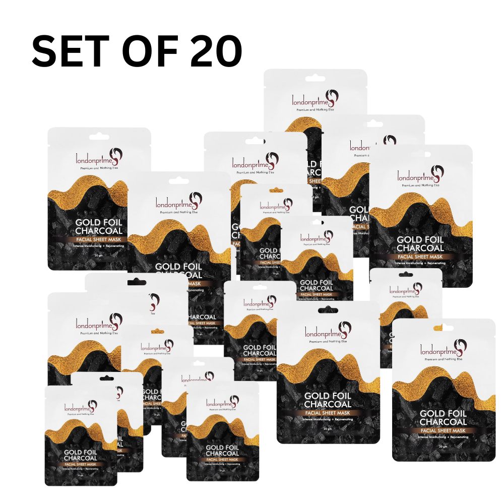 London Prime Gold Foil & Charcoal Facial Sheet Mask Set of 20 – Brightening, Moisturizing & Anti-Wrinkle Glow Boost