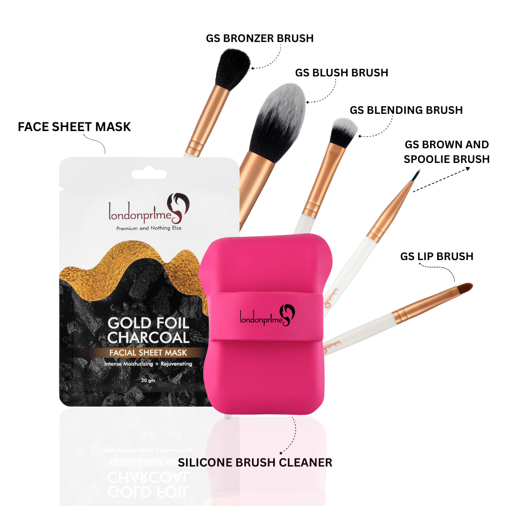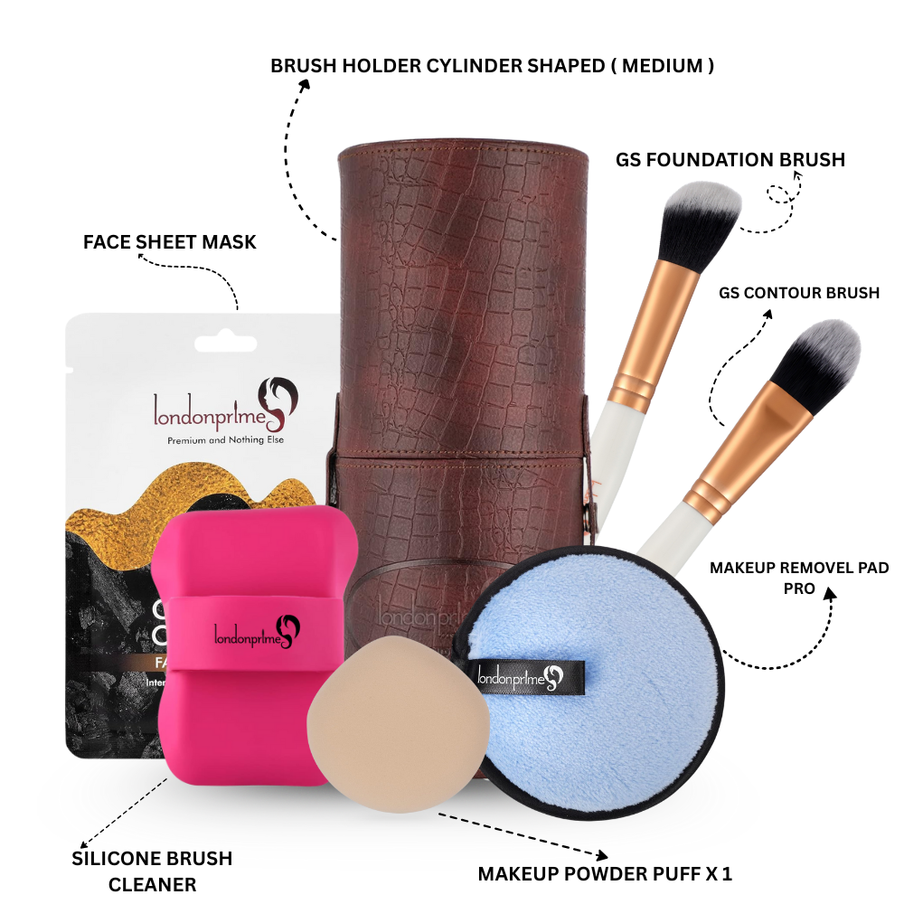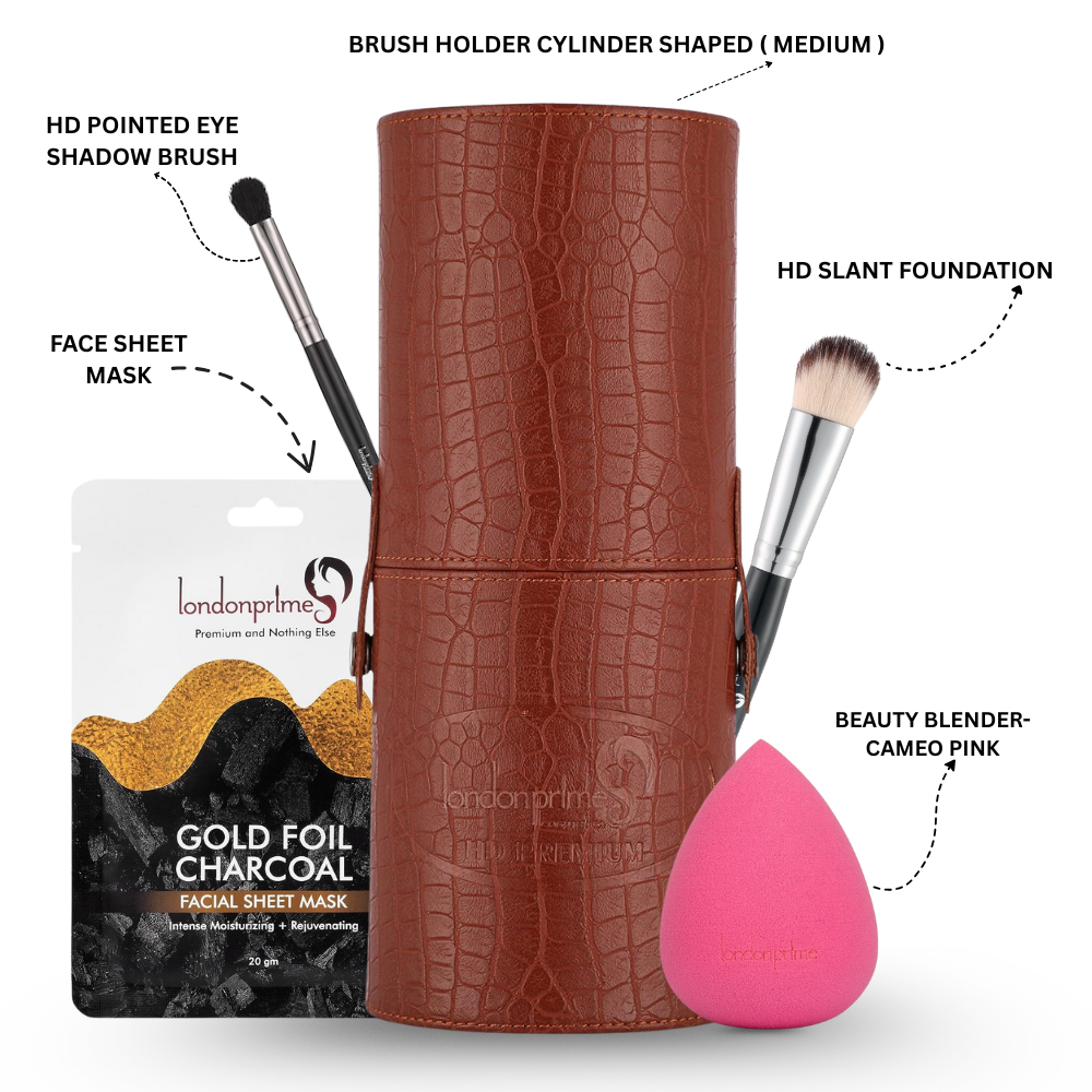 London Prime Ultimate Glow & Blend Combo – Brush Holder (Medium) + HD Slant Foundation Brush + HD Pointed Eyeshadow Brush + Precision Beauty Blender + Gold Foil Facial Sheet Mask