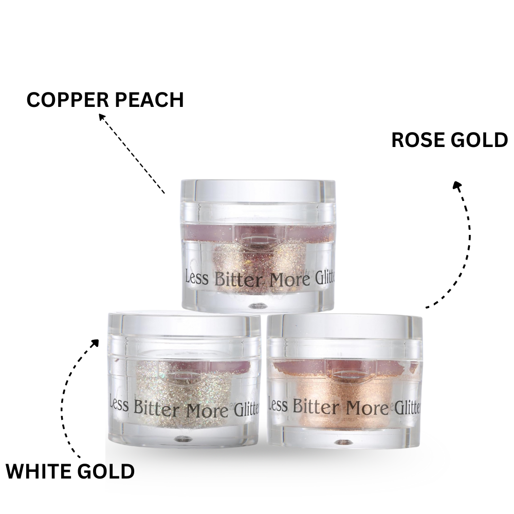 London Prime 3-in-1 Premium Glitter Set – White Gold, Copper Peach & Rose Gold | Ultra-Fine, Long-Lasting Makeup Glitter for Face, Eyes & Nails