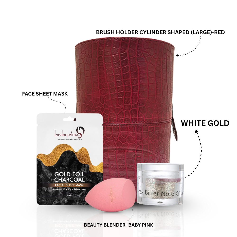 London Prime Glam Glow Makeup Essentials Combo (Brush Holder-Red + White Gold Glitter + Beauty Blender Baby Pink + Gold Foil Facial Sheet Mask) (Combo-3)