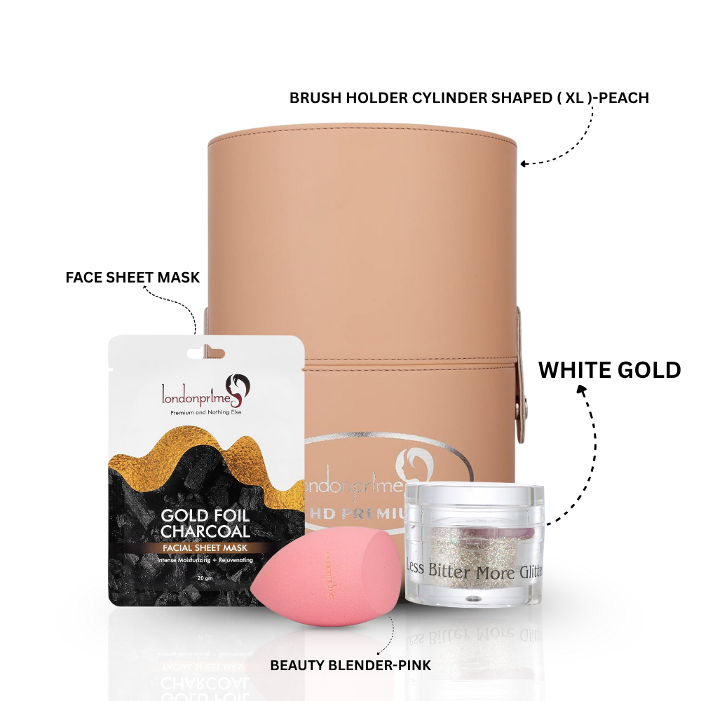 London Prime Glam & Glow Essential Combo (4-in-1) – Brush Holder XL Peach + White Gold Glitter + Pink Precision Beauty Blender + Gold Foil Sheet Mask (Combo-6)