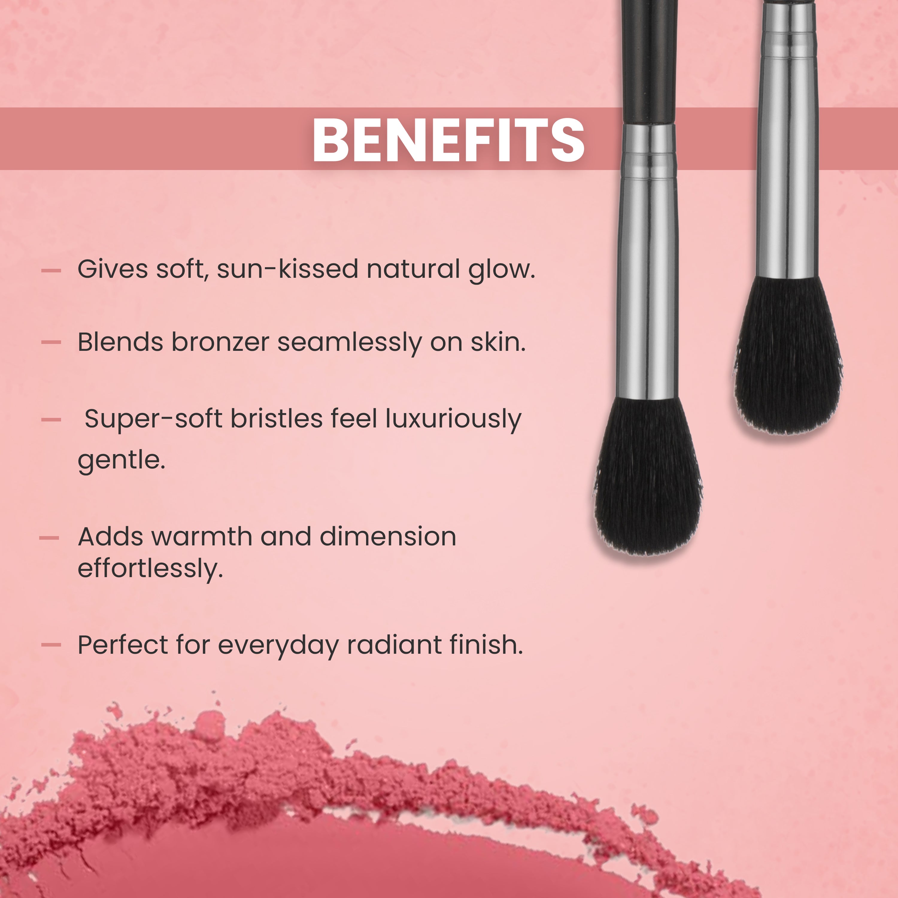 The brush has a perfectly sized fluffy head that allows for soft, diffused bronzer application. Whether I’m warming up the face or adding dimension along the cheekbones and hairline, it blends the product effortlessly without creating harsh lines.