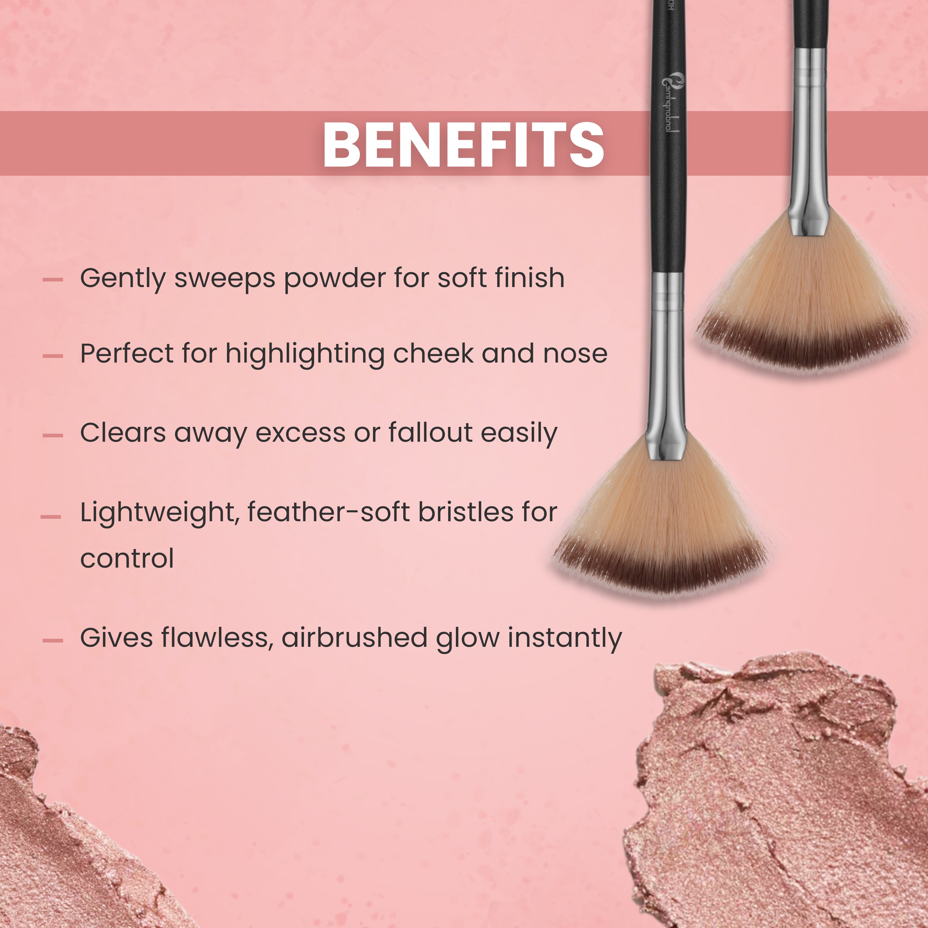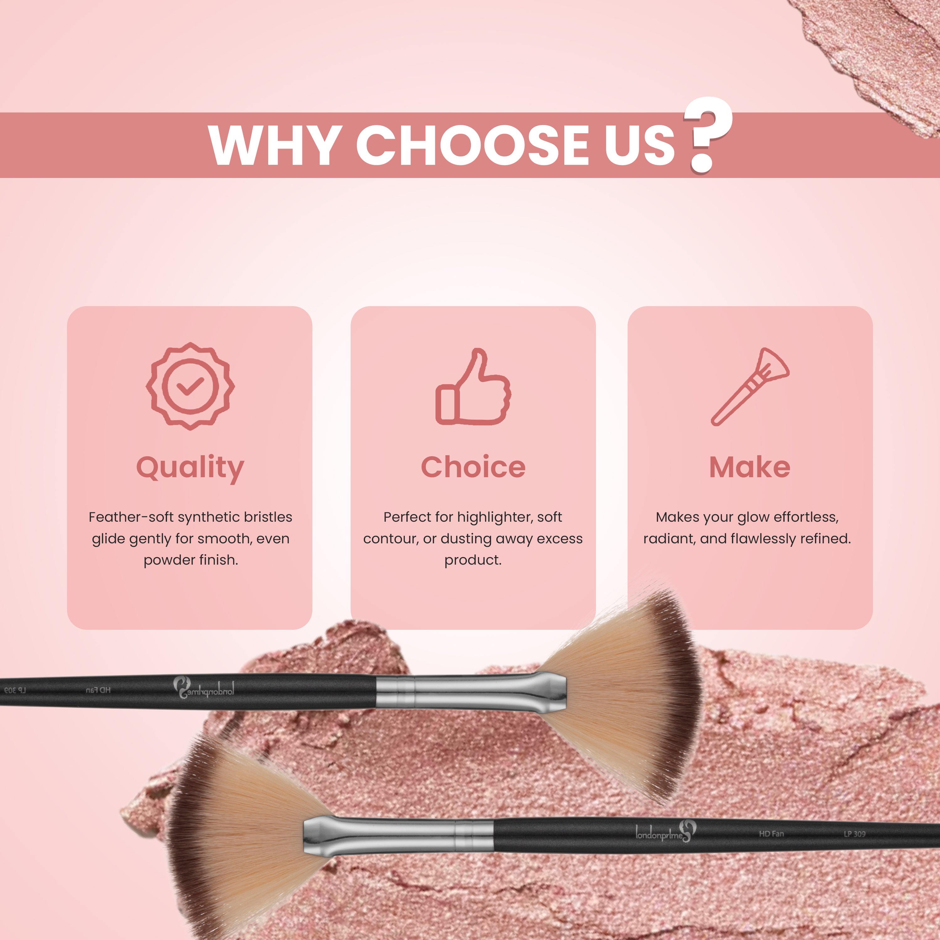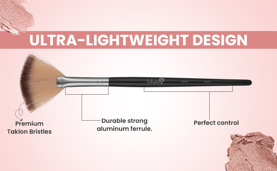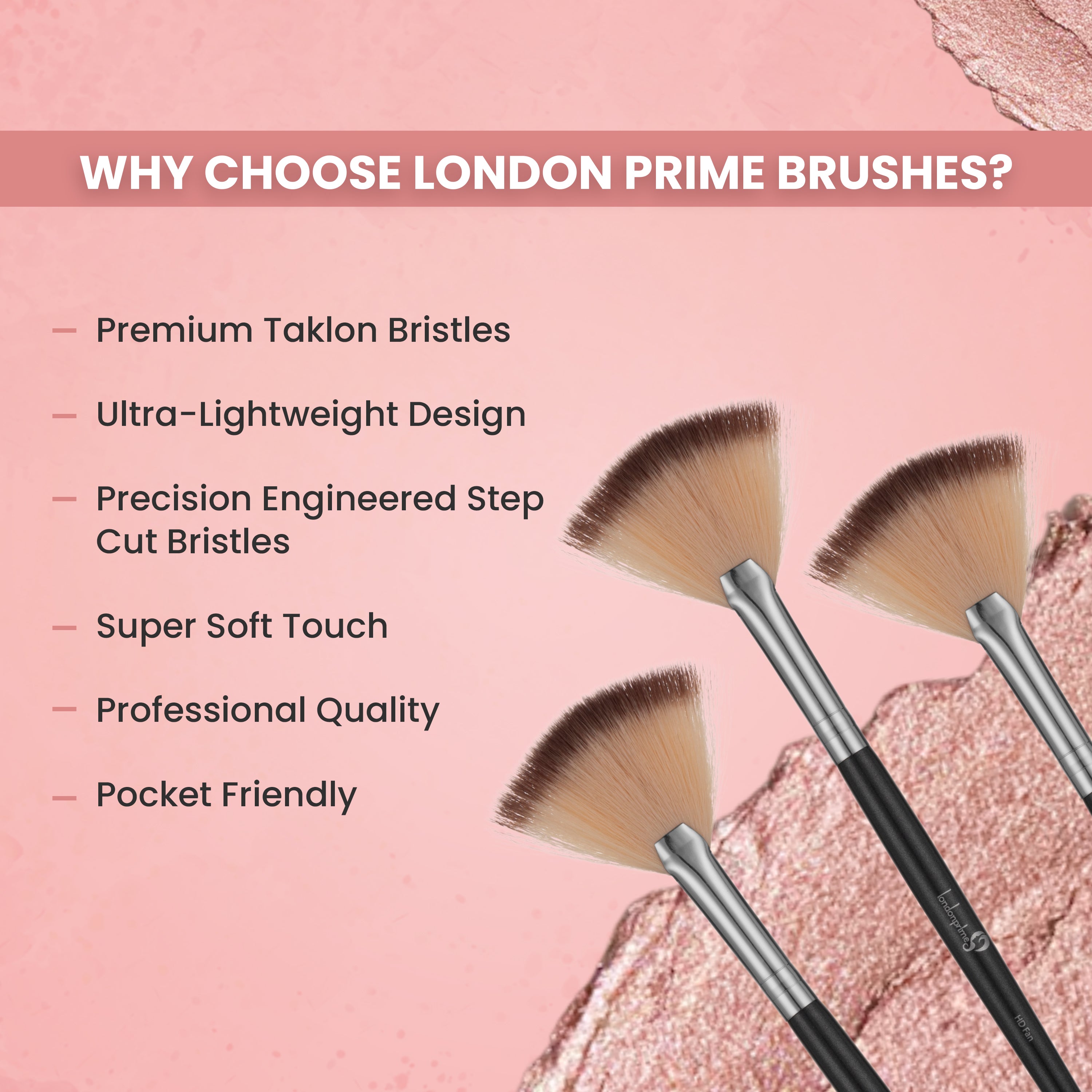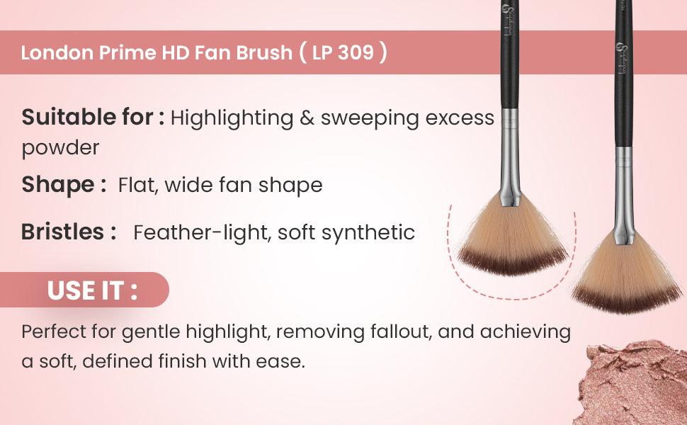 London Prime Cosmetics HD Fan brush allows you to gently sweep powder giving an even look due to its flat fan shape its facile for even and soft definition makeup look. This exotic looking and light weight brush has two key purposes: applying a gorgeous highlight and cleaning up powder makeup mistakes. They have feather like bristles and are super lightweight with a perfect shape for a gentle application of powder or any highlighter underneath your cheekbone and tip of your nose. It can also be used to dust off excess powder fallout. It is an expert tool to clear away sharp edges left by blusher or bronzer. It is a must have brush that is made of 100% synthetic material which is softly packed to give a perfect fan shape to fan away excess product like eye makeup fall out.