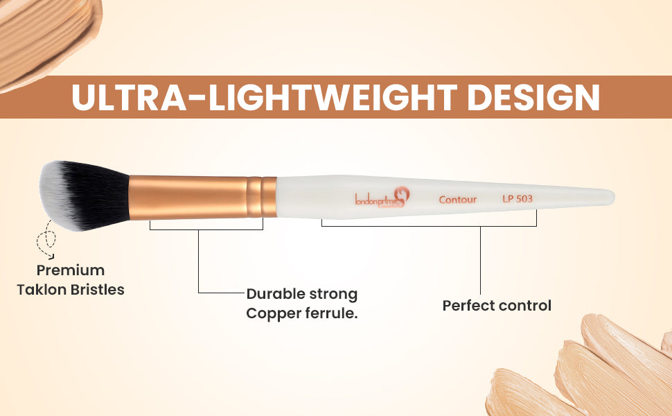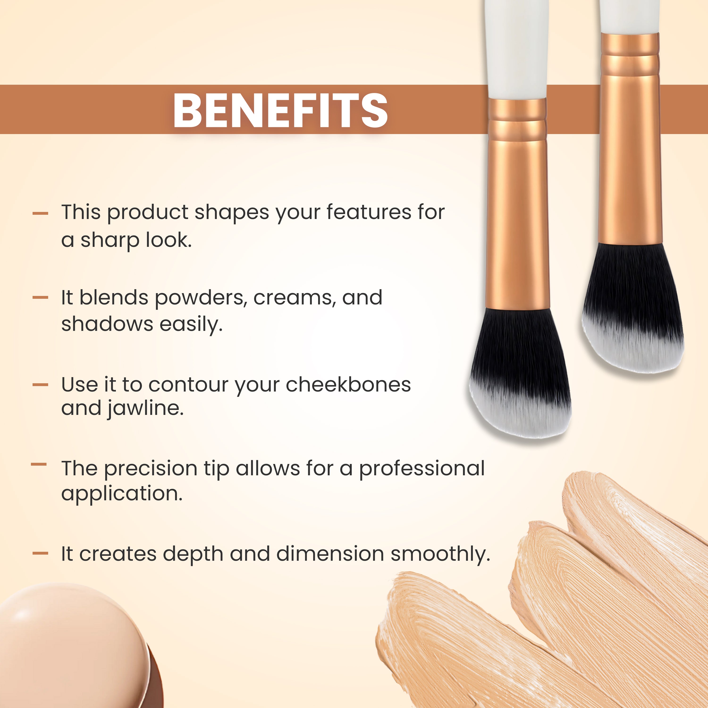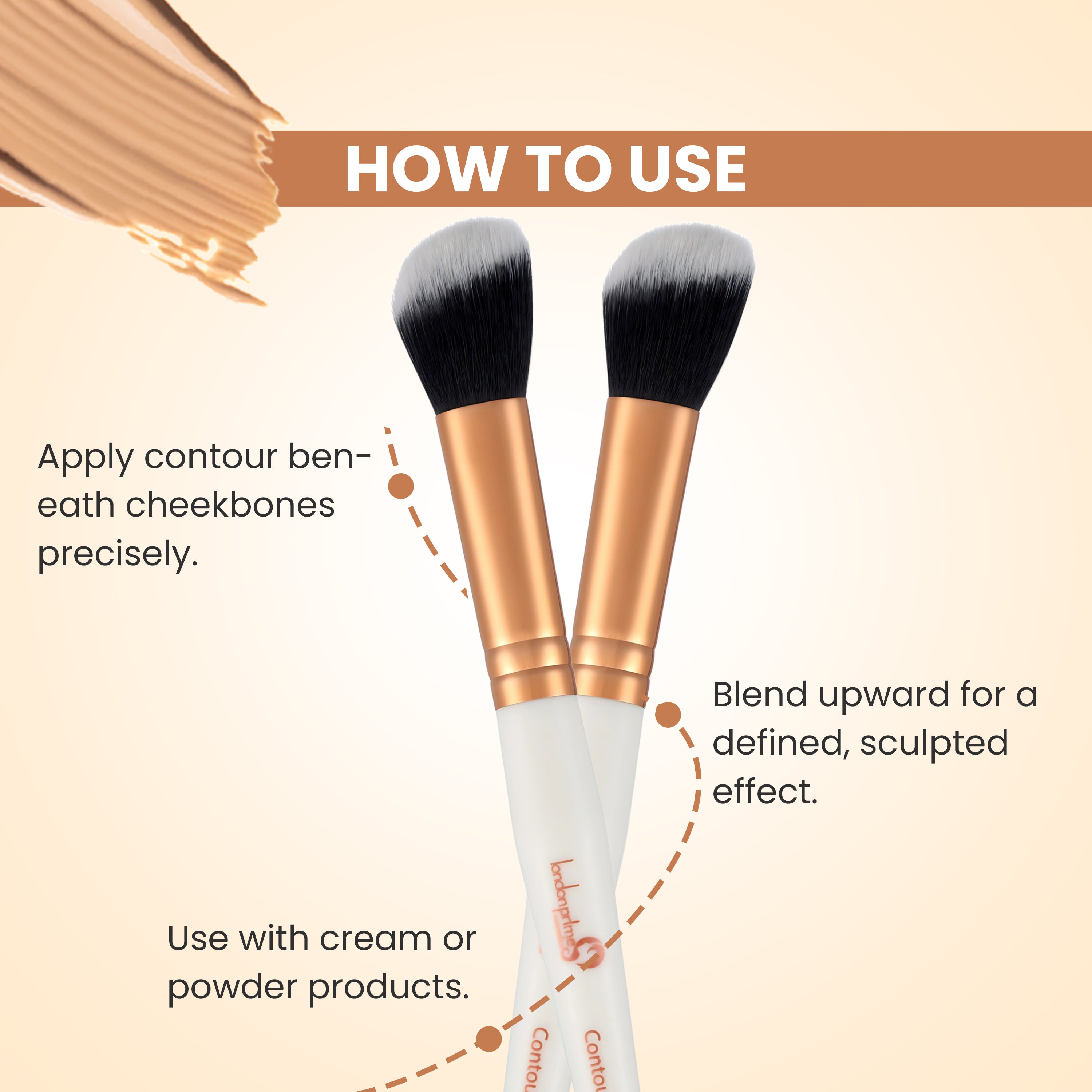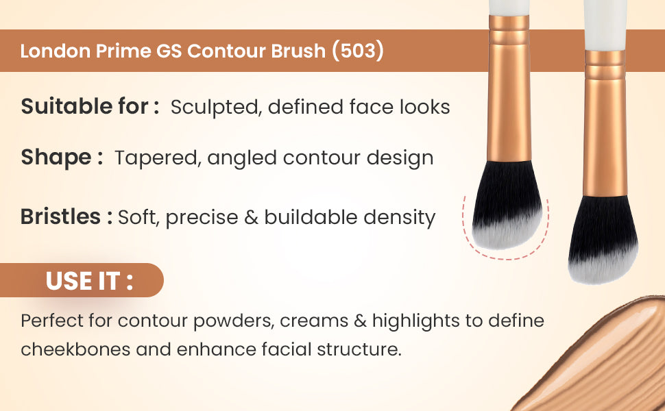 Glam strokes Contour brush is specifically designed for advanced makeup application to help getting professional looks. The densely packed hair and structured shape gives flawless results to the cheekbones, forehead and jawline for targeted contouring. Perfect for using with loose bronzer powder, liquids and creams.