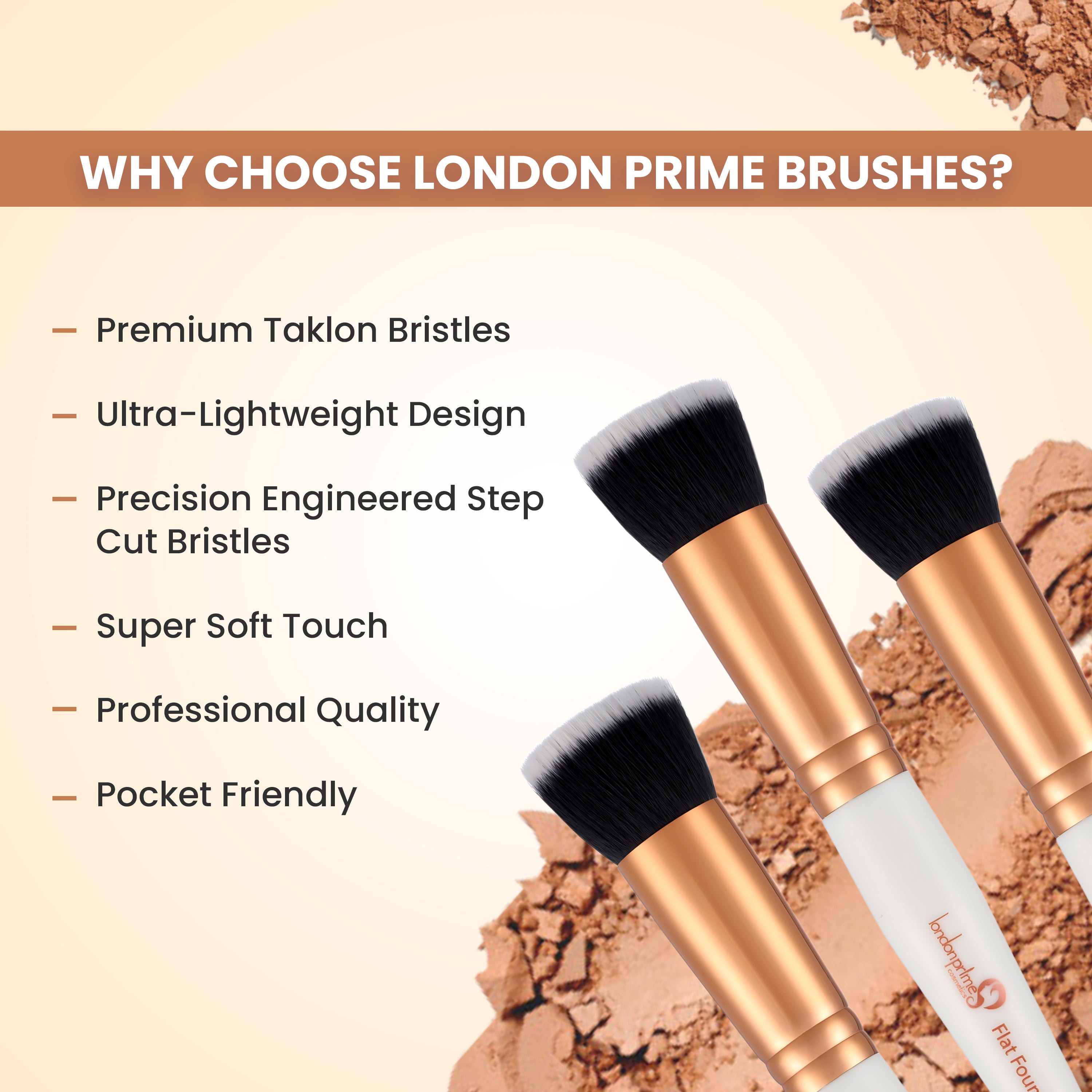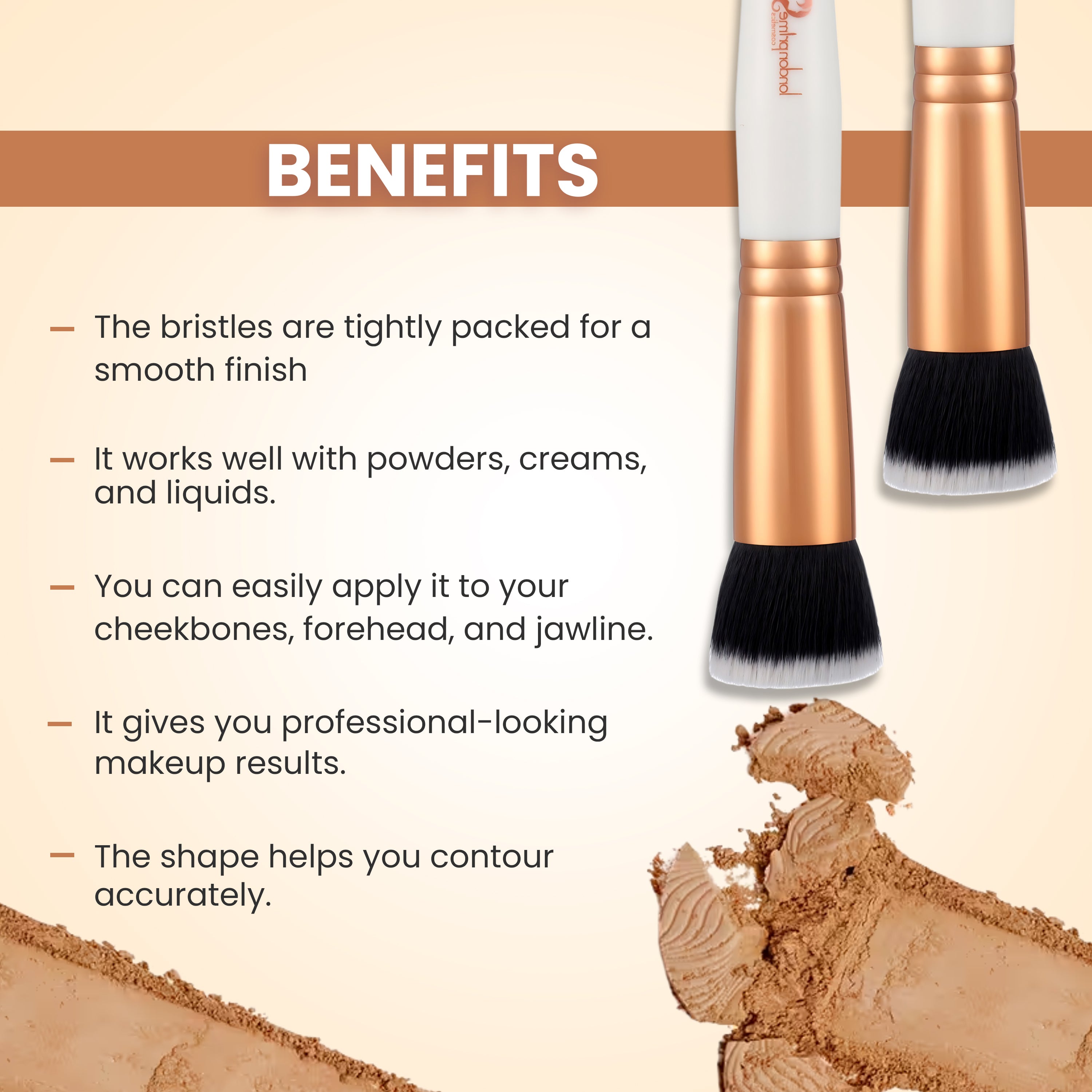 Glam strokes Flat Contour brush is specifically designed for advanced makeup application to help get professional looks. The densely packed hair and structured shape gives flawless results to the cheekbones, forehead and jawline for targeted contouring. Perfect for using with loose bronzer powder, liquids and creams.