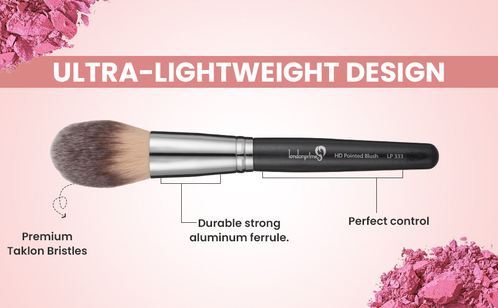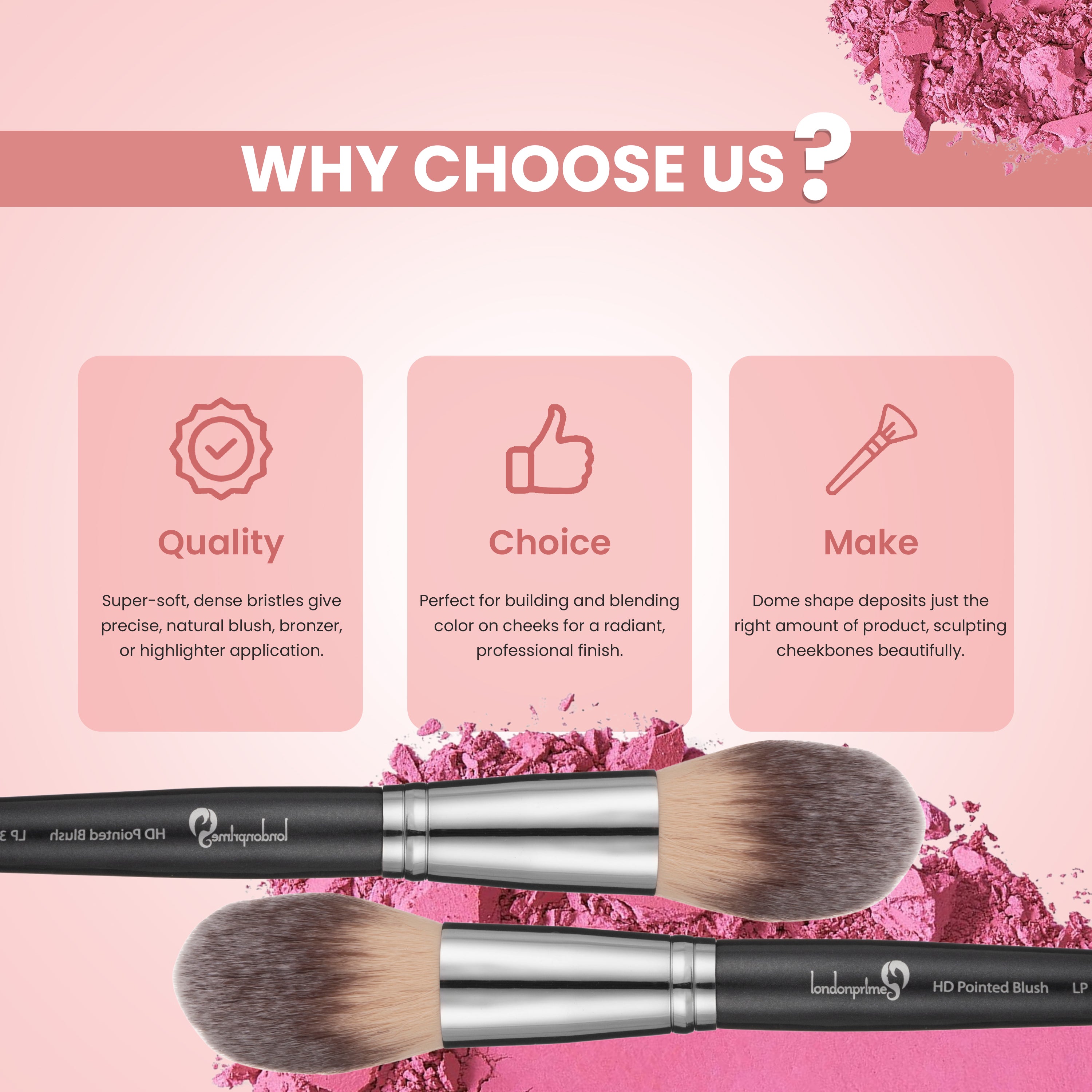 London Pride Cosmetics HD Pointed , round and soft Blush brush is used for applying blush, bronzer or highlighters. This brush is having more densely packed bristles for an effective use for blushing to get a splendid look. It possesses soft and a perfect shape to create the most natural looking blush. It features a dome shape with long, super-soft bristles that allows you to apply more concentrated product than any other brush, while still allowing you to blend and build colors. It is being designed in such a way that its bristles make it easier to apply products perfectly to your cheekbones.
